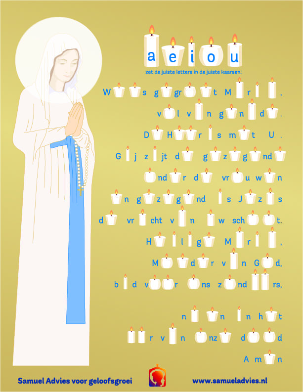 Speciaal voor kinderen die niet graag kleuren een puzzel met kaarsjes om het belangrijke gebed tot Maria, het Wees gegroet te leren kennen.