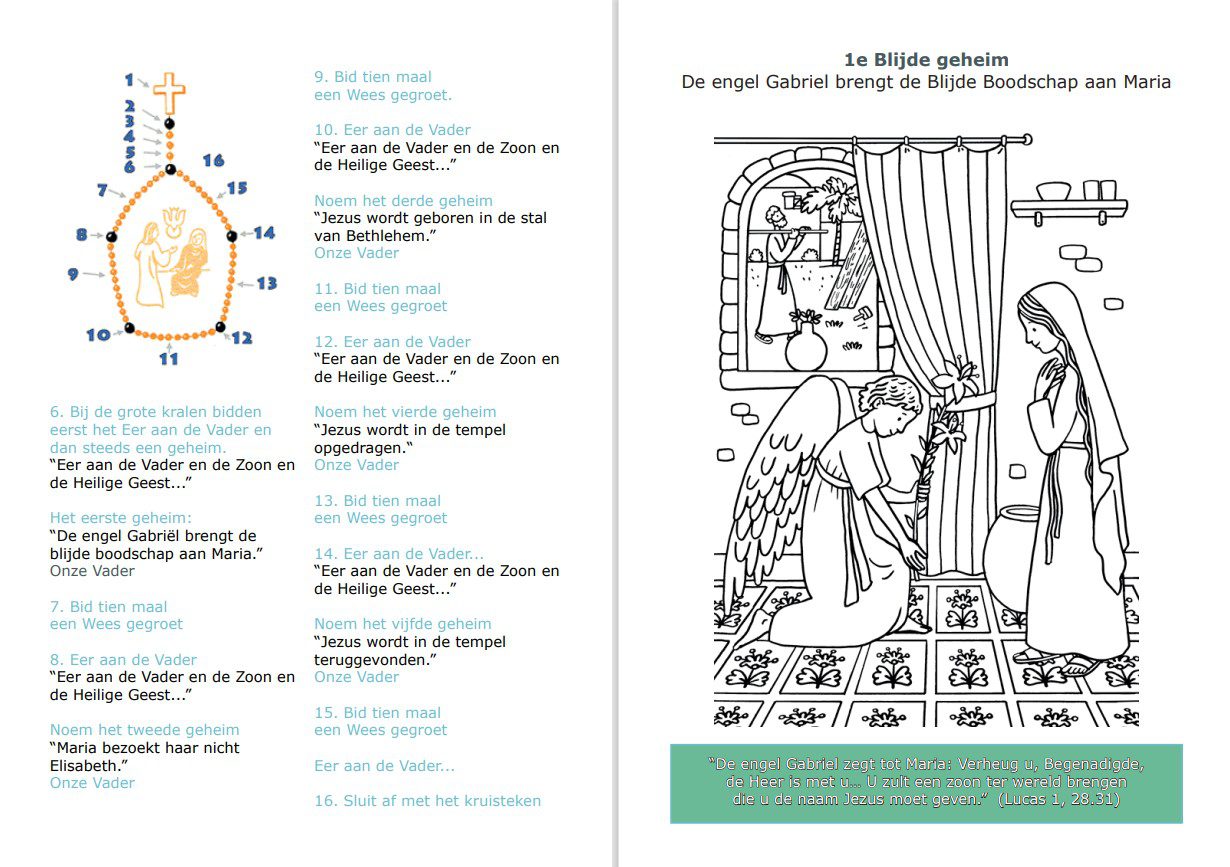 Rozenkransboekje kleur- en gebedsboekje om zelf te printen. Met kleurplaten van de Blijde Geheimen en uitleg van het Rozenkransgebed. Bid jij ook mee?