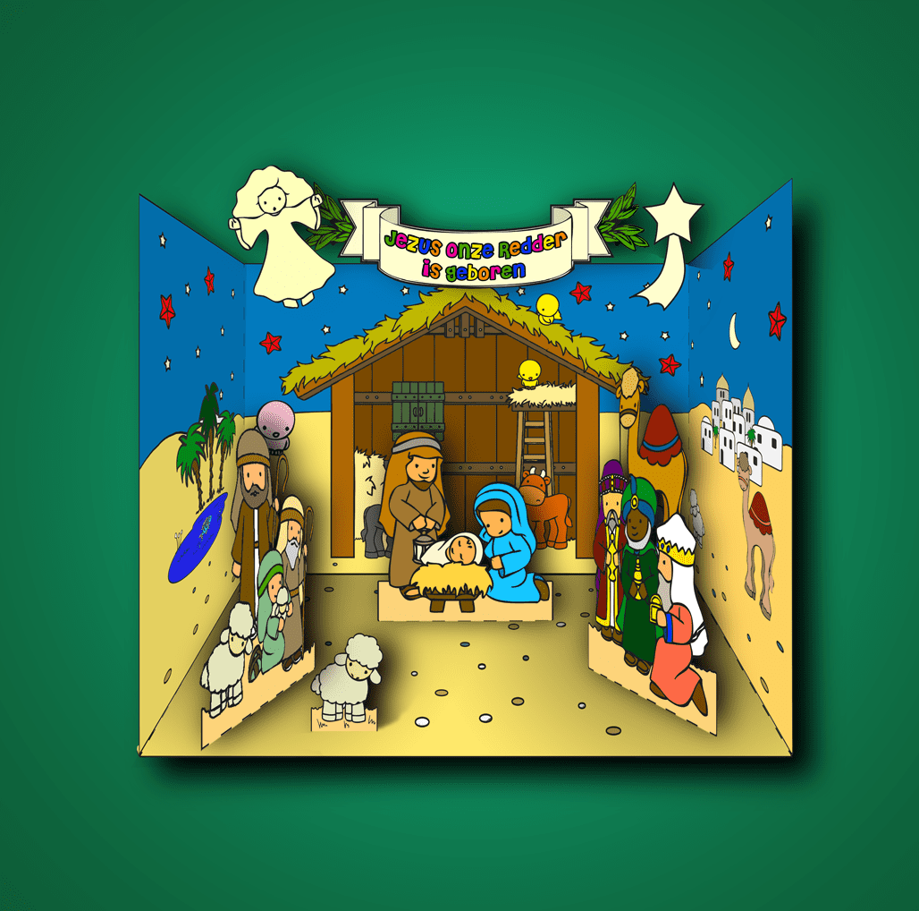 Stalletje om op te zetten, met Maria, Jozef en kindje Jezus en de herders en koningen. (kleuren, knippen, vouwen en plakken).