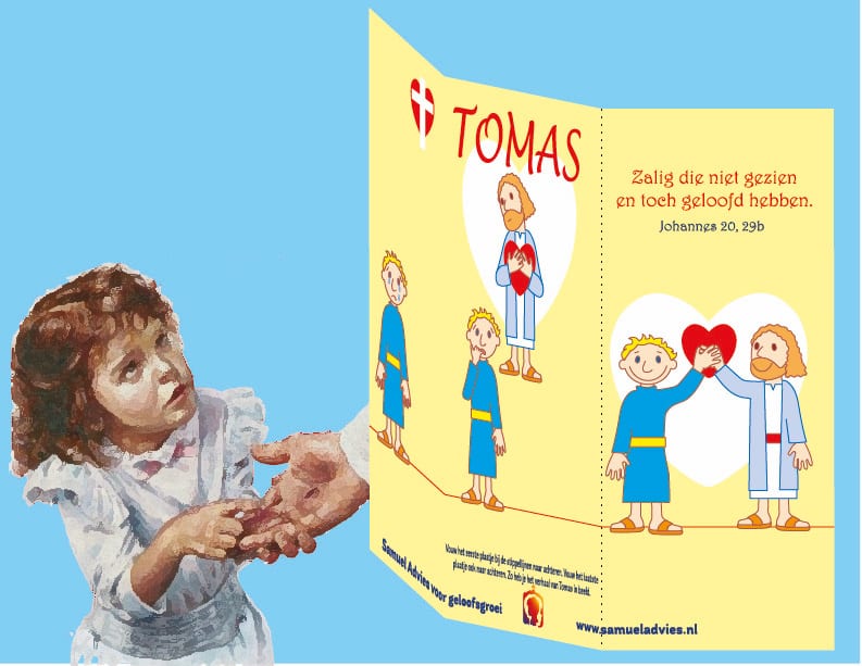 Tomas heeft de verrezen Jezus bij zijn eerste verschijning niet gezien. Eerst gelooft hij niet dat Jezus weer leeft. Maar dan ziet hij Jezus ook en mag hij zelfs de kruiswonden aanraken! Wij zien Jezus niet maar geloven wel dat Hij is opgestaan uit de dood en leeft.