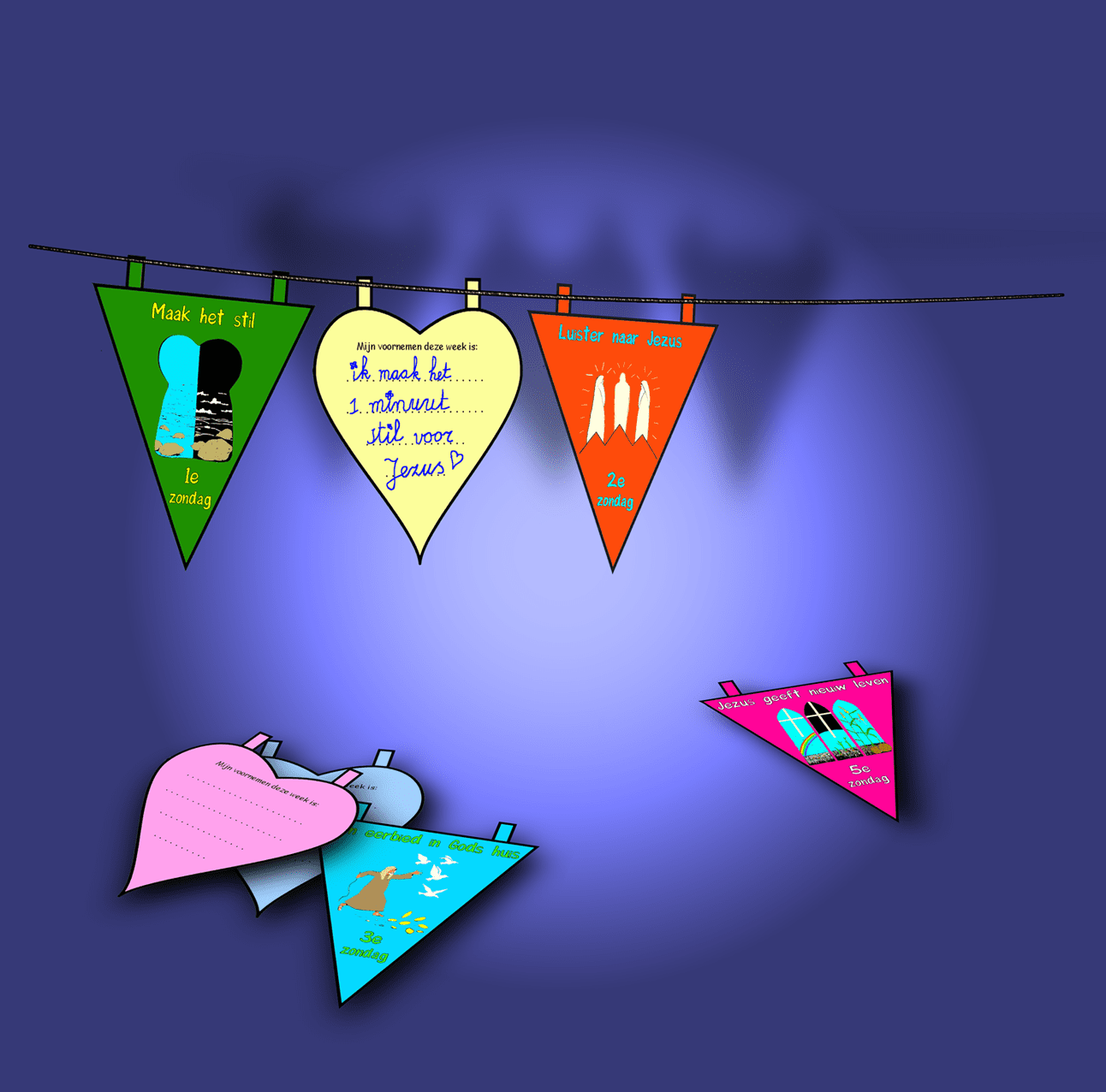 Voor iedere zondag (in het jaar B) een vlaggetje om aan een slinger te hangen. Met daarop het thema van de zondag en een extra kaartje om je voornemen op te schrijven. Leuk om thuis te gebruiken en ook bij de kinderwoorddienst. Zie ook het bijbehorende document ‘Project Veertig- en Vijftigdagentijd’ jaar B.