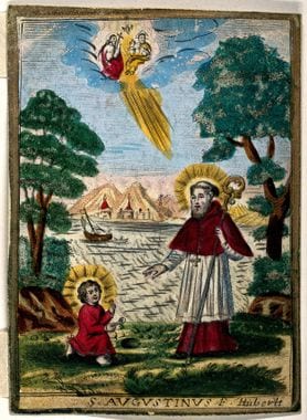 Augustinus heeft veel theologische werken geschreven die nu nog steeds een grote rol spelen in de katholieke leer. Terwijl hij jarenlang studeert op het mysterie van de H. Drie-eenheid, wandelt hij op een dag langs het strand. Daar ziet hij een klein jongetje dat met een schelp water van de zee naar een klein gat op het strand brengt. Hij vraagt het jongetje wat hij aan het doen is. Deze antwoordt dat hij al het water van de zee naar dat gat in het zand wil brengen. Augustinus merkt op dat dat toch echt niet kan. Het jongetje antwoordt dat een mens evenmin het mysterie van de heilige Drie-eenheid kan begrijpen… en verdwijnt uit het zicht.