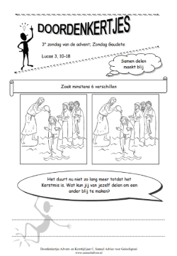 Vandaag horen we in alle lezingen en gebeden in de kerk het woord “Verheug je” heel vaak terugkomen. We vieren bijna de Geboorte van Jezus, dat is een Blijde Boodschap die ons vreugde kan geven. De vorige week hebben we ook al Johannes de Doper ontmoet. Wie kan er nog iets over hem vertellen? Vandaag horen we in het evangelie hoe hij als voorbereiding op de komst van Jezus de mensen toespreekt. Hij vraagt hen met elkaar te delen en anderen niet uit te buiten. Hoe kun jij deze week iets delen met anderen? Met wie kun je de Blijde Boodschap van Jezus delen?