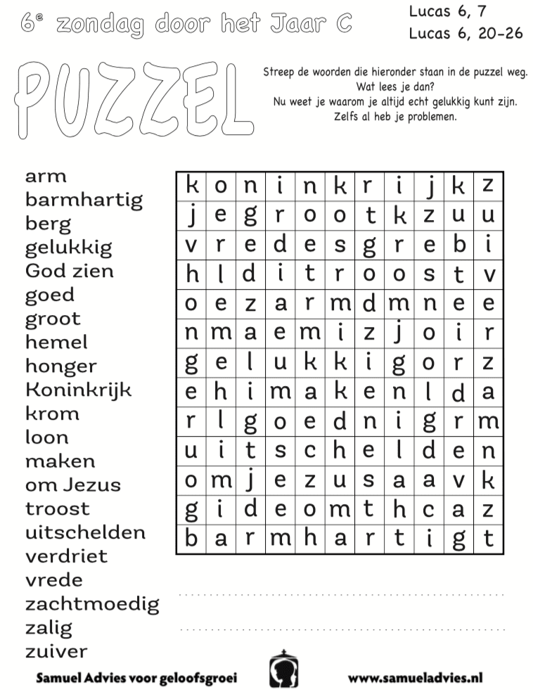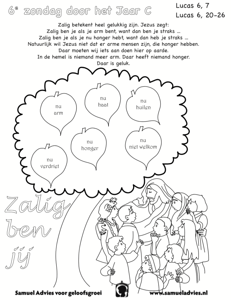 De eerste lezing en de tussenpsalm zijn een mooie aanvulling op de betekenis van het evangelie. Bespreek met de kinderen wie zij het meest vertrouwen. Waarom is dat zo? De lezingen van vandaag nodigen ons uit om meer en meer op God te vertrouwen. Soms is het zo dat je een ander mens vertrouwt en dan gebeurt er iets waardoor je die ander niet meer kan vertrouwen. Wie heeft dat wel eens meegemaakt? Op God kun je altijd vertrouwen! Hij is de Bron van ons bestaan en gelukkig ben je wanneer je dat beseft; gelukkig ben je wanneer je je troost zoekt bij God en wanneer je je door zijn liefde laat vullen. Ieder van ons maakt moeilijke en verdrietige dingen in het leven mee. Maar Jezus prijst ons zalig (gelukkig) als we daarmee naar God gaan en ons door Hem laten helpen. Gelukkig ben je wanneer je beseft dat je afhankelijk bent van je Schepper.
