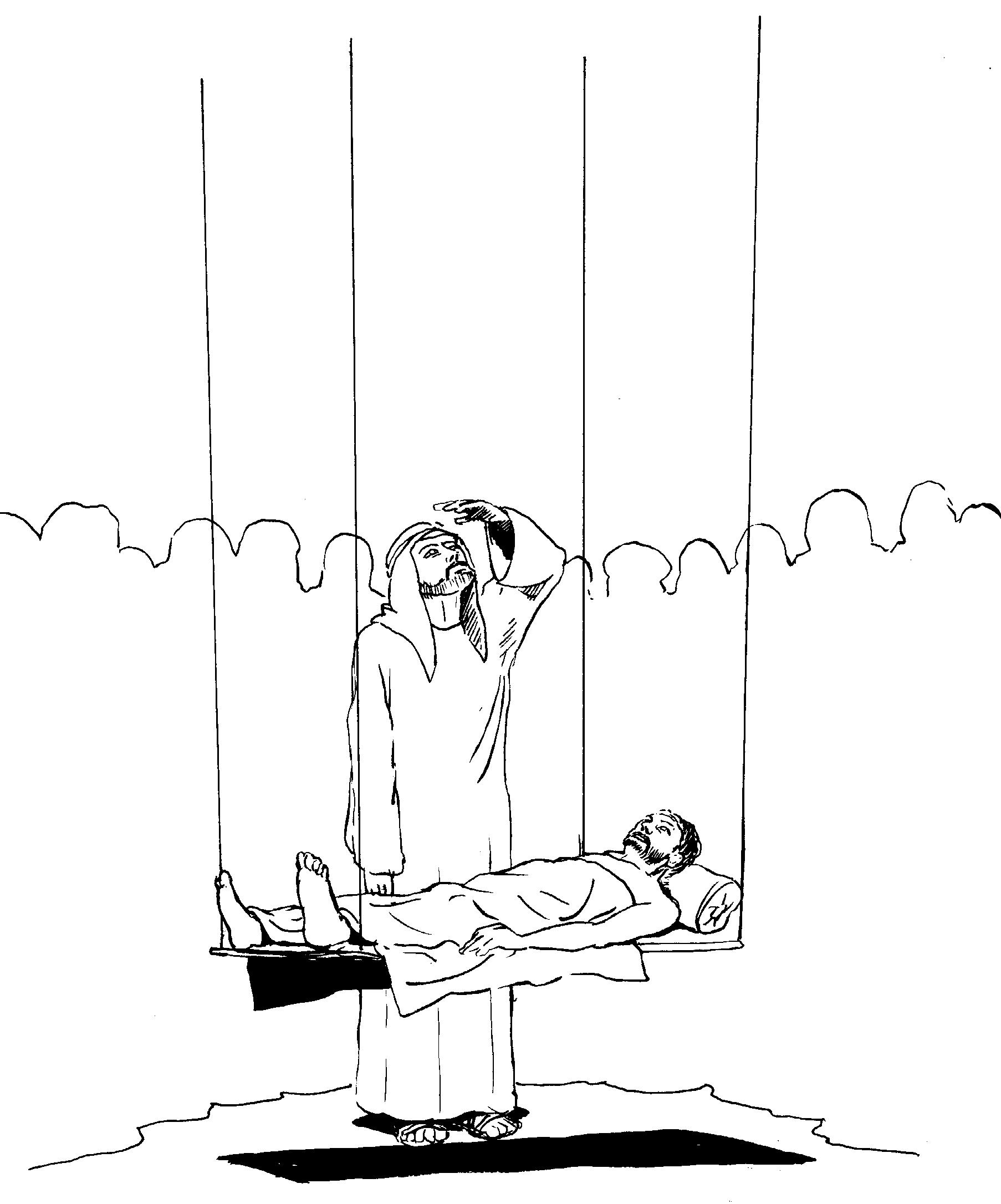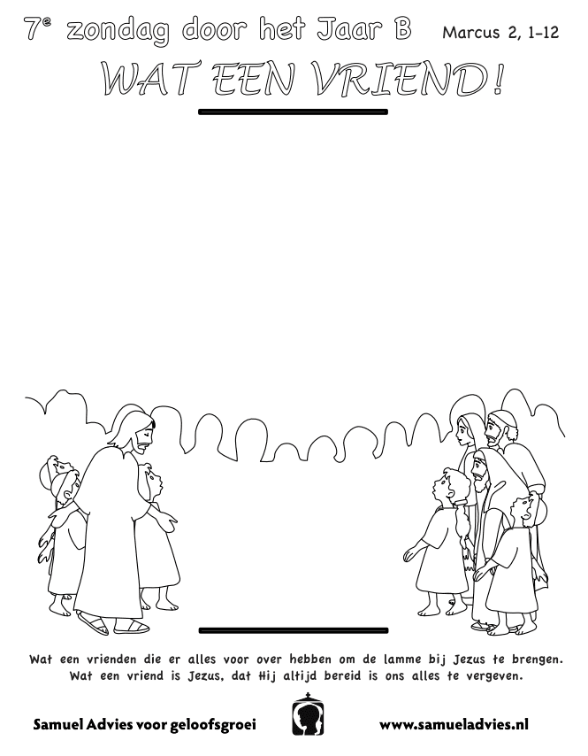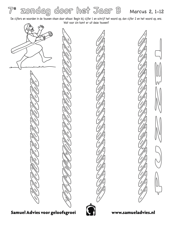 PS: Dit evangelieverhaal kun je heel beeldend vertellen met vier stroken papier die je met splitpennen aan elkaar maakt. Dit gebruik je als bed (alles over elkaar gevouwen), als trap, als gat waardoor ze het bed laten zakken, als persoon die weer rechtop loopt…