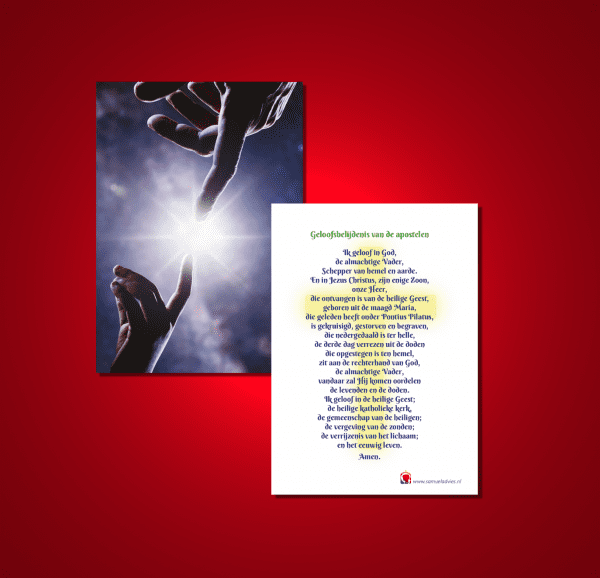 Mooi uitgevoerde gelamineerde stevige kaart met de 12 artikelen van het geloof die we iedere zondag samen in de kerk bidden.